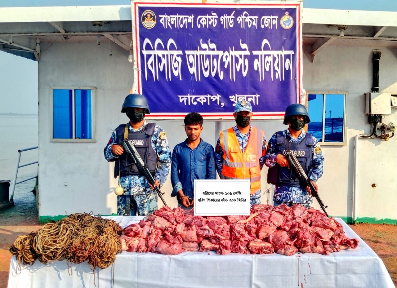কোস্ট গার্ডের অভিযানে ১০৬ কেজি হরিণের মাংস ও ফাঁদসহ ১ জন হরিণ শিকারি আটক