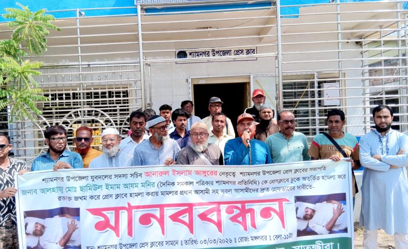 যুবদল নেতার নেতৃত্বে প্রেসকাব সভাপতির ওপর হামলার প্রতিবাদে শ্যামনগরে মানববন্ধন